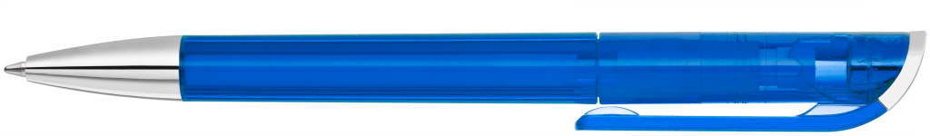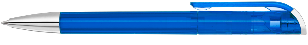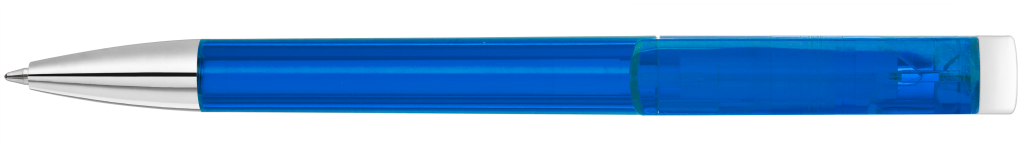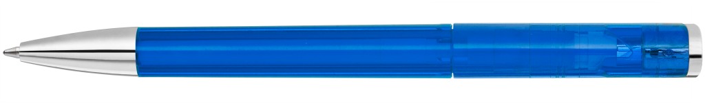 Drehkugelschreiber mit transparent glänzendem Gehäuse, Stopfen und Spitze glanzverchromt.