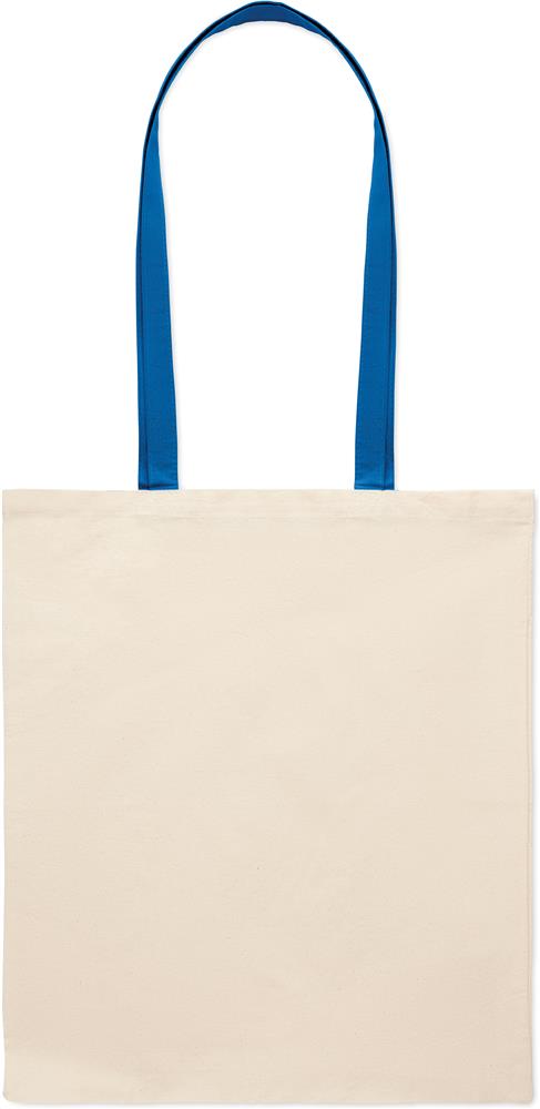 Einkaufstasche aus Baumwolle mit langen, farbigen Tragegriffen. 140 g/m².