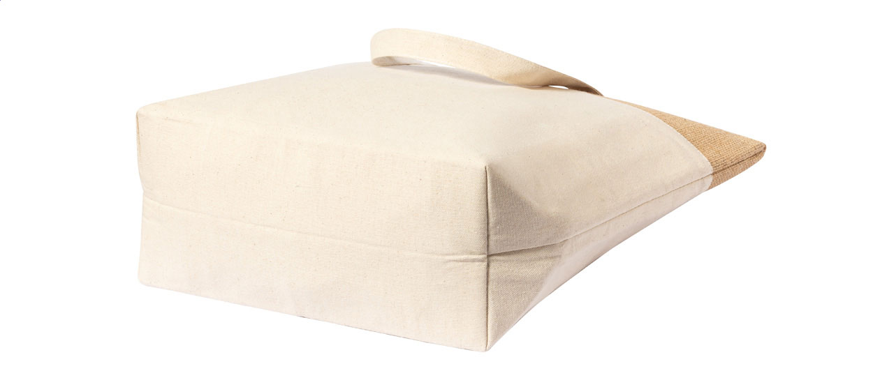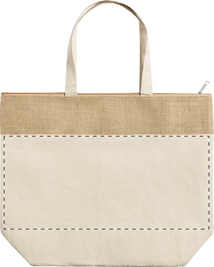 Kühltasche mit Aluminiumpolsterung und Reißverschlussfach. Material: 100 % Baumwolle und laminierte Jute.