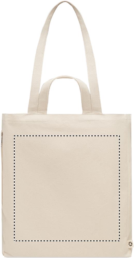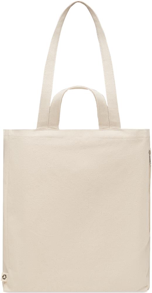Einkaufs- oder Strandtasche aus recyceltem Polycotton (70% recycelte Baumwolle, 30% recycelter Polyester) mit kurzen und langen Griffen. Sie hat eine Seitentasche mit Reißverschluss. 380 g/m².