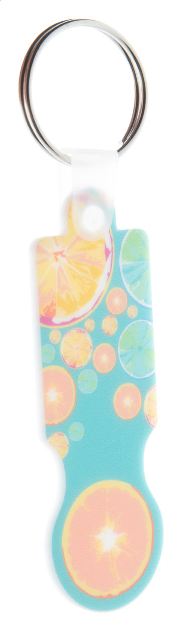 Einkaufswagen-Chip/Schlüsselanhänger aus Kunststoff mit vollfarbiger Bedruckung (CMYK). Der Preis ist inkl. UV-Druck auf einer Seite. Mindestmenge: 200 Stk.