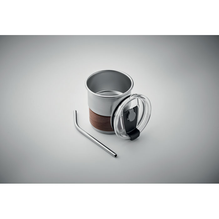 Einwandiger Becher aus recyceltem Edelstahl (90% recycelter Edelstahl, 10% Edelstahl) mit abnehmbarem Griffteil aus Akazienholz. Trinkhalm aus Edelstahl mit Halterung. Auslaufsicherer Deckel mit Trinköffnung. Füllmenge: 260 ml. Da der einwandige Becher die Hitze nach Außen leiten kann, kann der Artikel heiß werden.