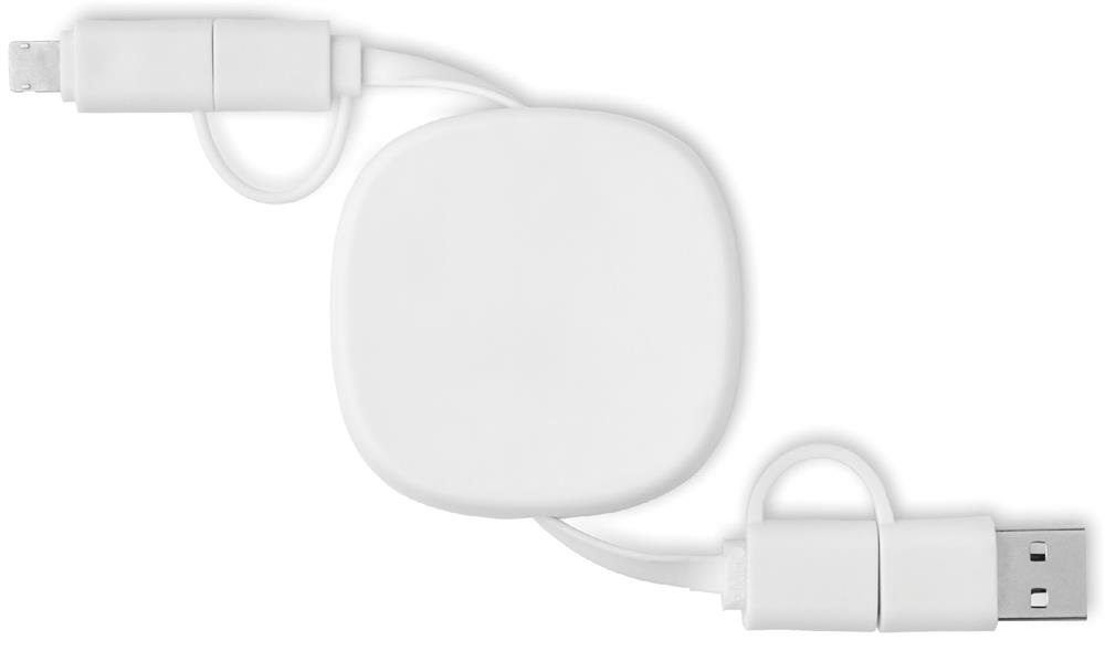 Einziehbares Ladekabel 60W. Gehäuse aus recyceltem ABS. Eingang: 2in1 Typ-C und Typ-A. Ausgang: Typ-C und Mikro-B (2 in 1 Pin). Kabellänge: 80 cm.