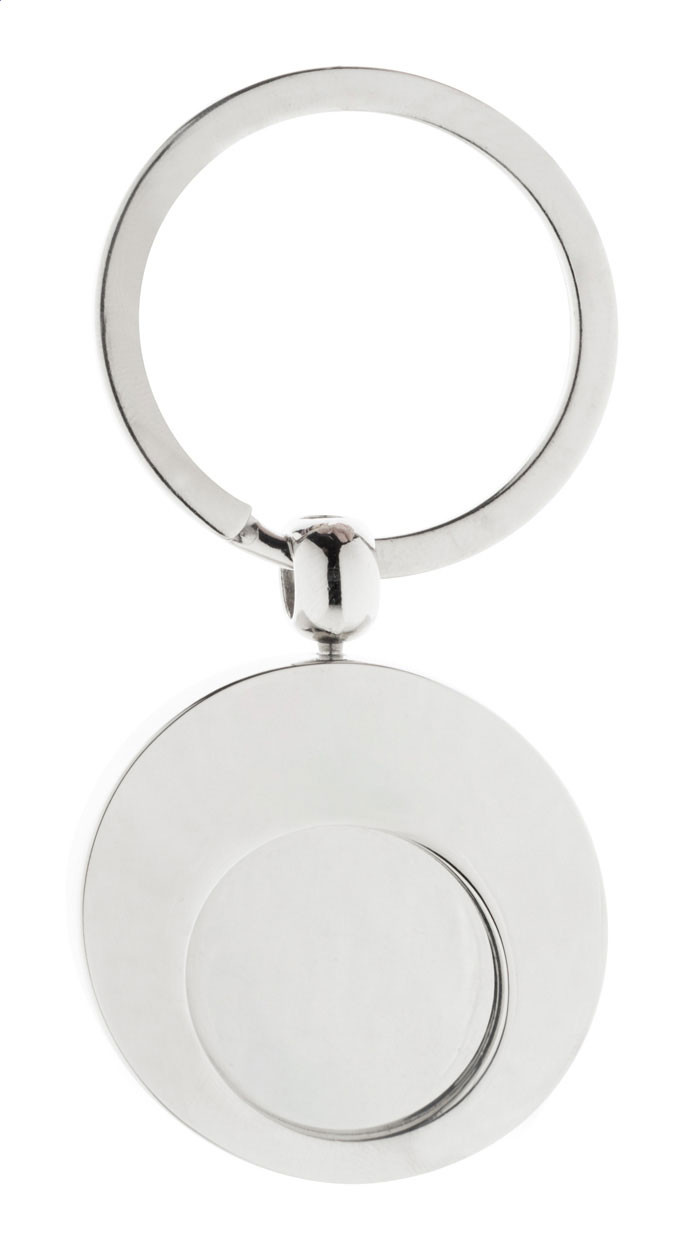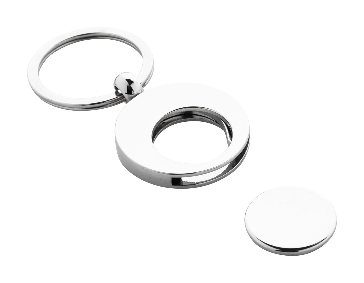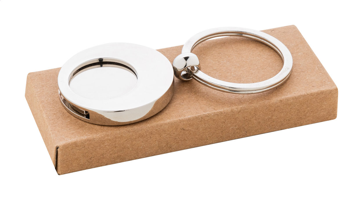 Runder Schlüsselanhänger aus Metall mit Einkaufswagen-Münze. In Kraftpapierbox.