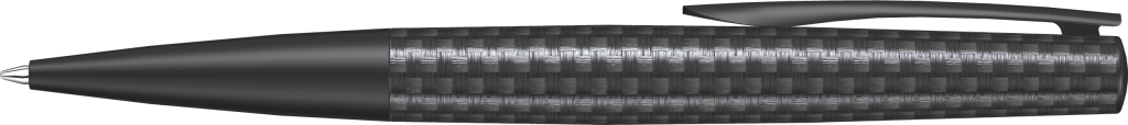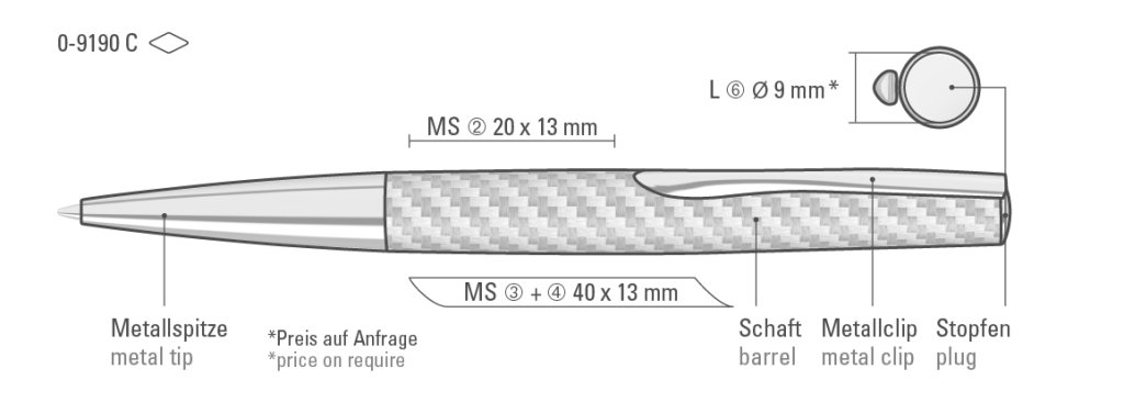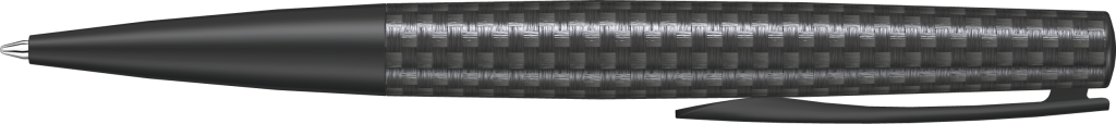 Metall-Drehkugelschreiber mit Schaft aus Carbonfaser in schwarz oder silber, gefederter Metallclip und schwere Metallspitze glanzverchromt bzw. Schaft aus Carbonfaser in schwarz, Metallclip und schwere Metallspitze schwarz matt lackiert und Softdrehmechanik.Druckbereich: In Clipverlängerung 20mm x 13mm Siebdruck (MS), seitlich vom Clip 40mm x 13mm Siebdruck (MS), gegenüber vom Clip 40mm x 13mm Siebdruck (MS), auf dem Stopfen 9mm x 9mm Lasergravur (L)