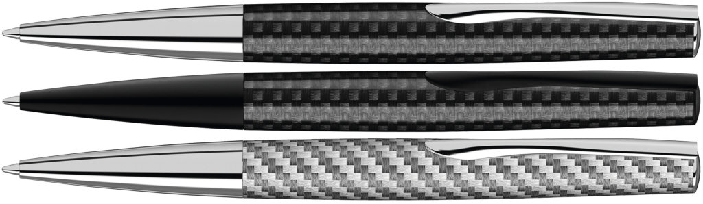 Metall-Drehkugelschreiber mit Schaft aus Carbonfaser in schwarz oder silber, gefederter Metallclip und schwere Metallspitze glanzverchromt bzw. Schaft aus Carbonfaser in schwarz, Metallclip und schwere Metallspitze schwarz matt lackiert und Softdrehmechanik.