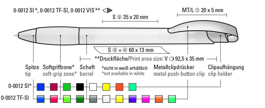 Druckbereich: In Clipverlängerung 35mm x 20mm Siebdruck (S), gegenüber vom Clip 60mm x 13mm Siebdruck (S), seitlich vom Clip 60mm x 13mm Siebdruck (S), auf dem Clip 20mm x 5mm Lasergravur (L), auf dem Clip 20mm x 5mm Tampondruck (MT), auf dem Clip 20mm x 5mm Einzelnamensgravur (EL)