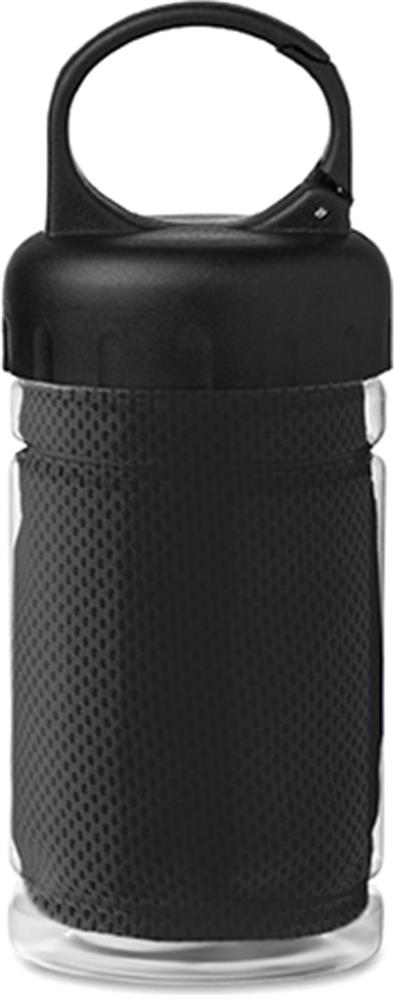 Handtuch aus 100% Polyester in einer PET Flasche. Benetzen Sie das Handtuch mit Wasser und erfrischen Sie sich. Füllmenge: 300 ml. Maße Handtuch: 30x80cm.