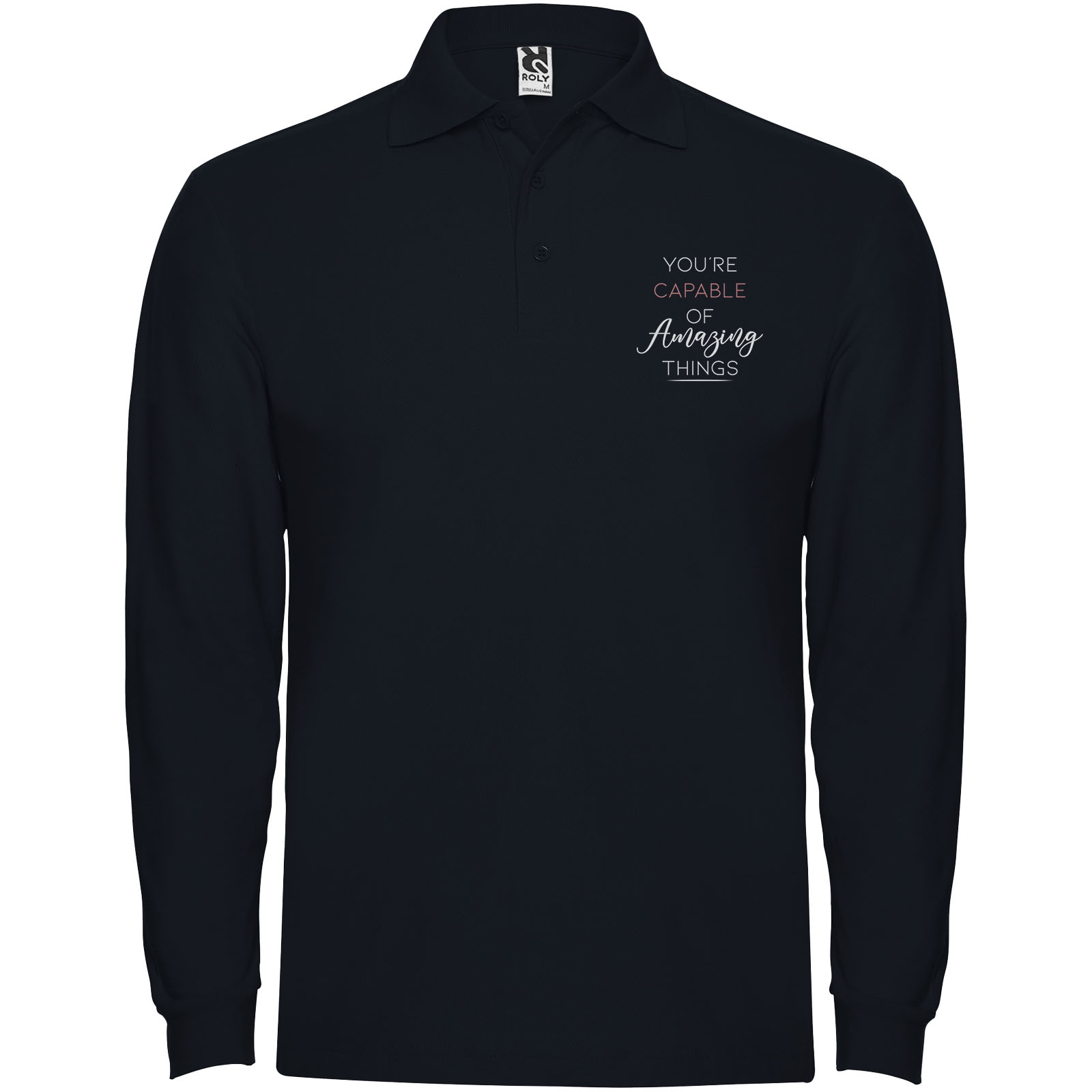 Langärmeliges Poloshirt mit geripptem Kragen und Ärmelbündchen, 3er-Knopfleiste und 1×1-Rippstrickbündchen an den Ärmeln.Verstärkte und verdeckte Nähte am Kragen. Optionale Tasche. Herausnehmbares Etikett. Das Modell ist 190 cm groß und trägt Größe L.Besonderheiten:- Geschlecht: Männlich- OEKO-TEX®- SMETAMaterial: Piqué Strick 100% Baumwolle, 220 g/m2Grammatur: 220 g/m2Standard-Druck---------------Druckart: SiebdruckDruckposition: linke BrustDruckgröße: 120 x 120 mm mm (BxH)Druckfarben maximal: 5Zusätzliche Informationen: Schauen Sie bitte vor der Bestellung in die Roly Größentabelle. Roly folgt den spanischen Größen, die eine eher slim-fit Passform haben.Suchwörter: roly, Polo, Polos, Polohemd, Poloshirt