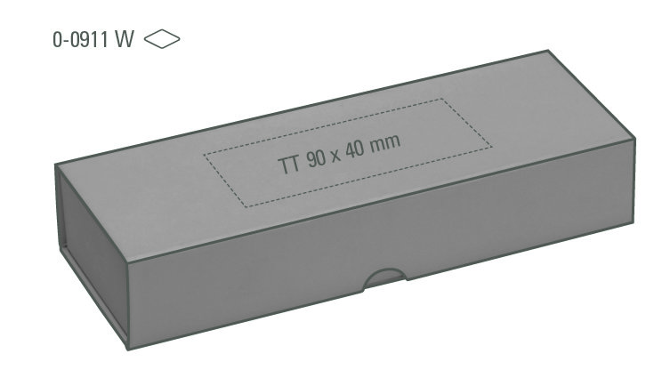 Klappetui in uni weiß oder schwarz mit Magnetverschluss für ein oder zwei Schreibgeräte. Kartonschuber in weiß. Auf Anfrage ist der Kartonschuber mit 4c-Gestaltung erhältlich.