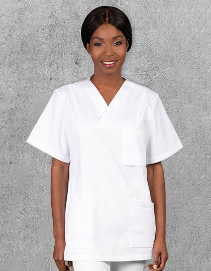 Soft TouchÜberlappender V-AusschnittHoch geschnitten mit 1 verdeckten Druckknopf1 Brusttasche, Größe: ca. 11,5 cm x 13 cm (Breite x Höhe)2 aufgesetzte SeitentaschenSeitenschlitzRückenlänge bei Gr. S 71 cmMaterial: 50% Baumwolle, 50% PolyesterGrammatur: 175 g/m²Gewicht: 0.186Hergestellt nach: Oeko-Tex 100Veredelung: Bestickung, Bedruckung, BeflockungFarbe: White