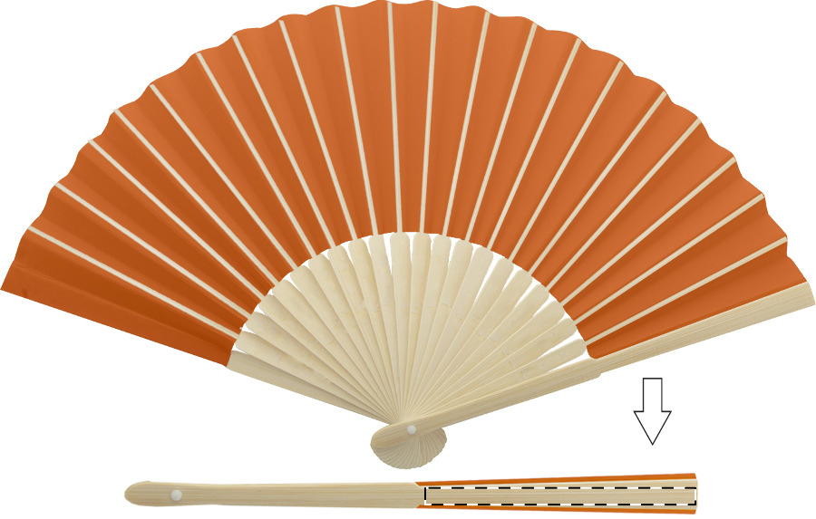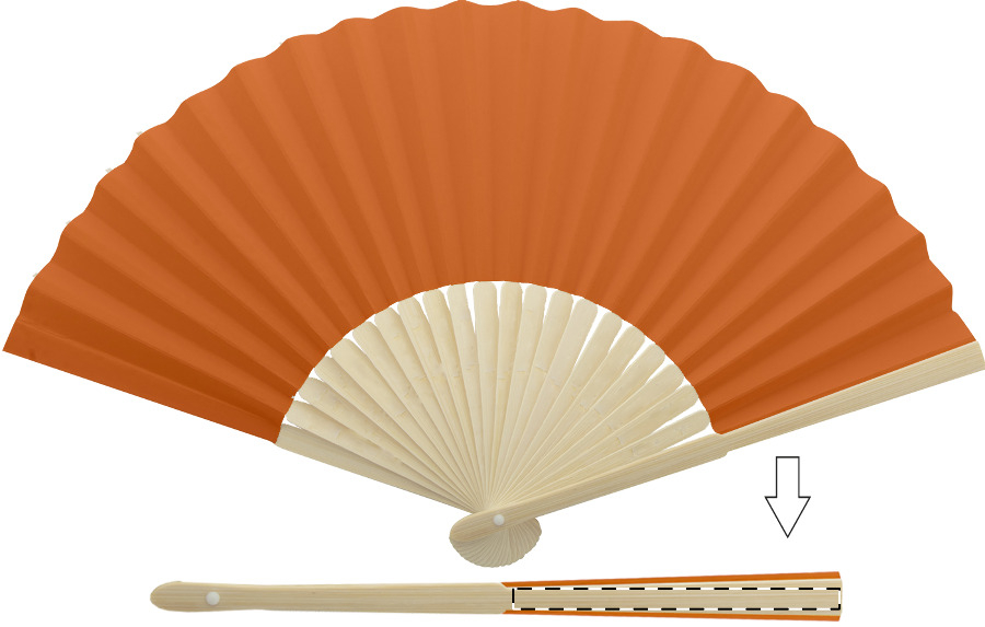 Handfächer aus Papier mit Bambusspeichen.Maße: 383×210 mmMaterial: Papier, BambusVeredelungsposition 1: VorderseiteTechnologie: GravurDurchmesser: 0Druckcode: E1Technologie: Gravur - EinzelnamenDurchmesser: 0Druckcode: NE1Technologie: TampondruckMaximale Farben: 2Durchmesser: 0Druckcode: P1Veredelungsposition 2: RückseiteTechnologie: GravurDurchmesser: 0Druckcode: E1Technologie: Gravur - EinzelnamenDurchmesser: 0Druckcode: NE1Technologie: TampondruckMaximale Farben: 2Durchmesser: 0Druckcode: P1Veredelungsposition 3: LinksTechnologie: TampondruckMaximale Farben: 1Durchmesser: 0Druckcode: P2Veredelungsposition 4: MittigTechnologie: TampondruckMaximale Farben: 1Durchmesser: 0Druckcode: P2Veredelungsposition 5: RechtsTechnologie: TampondruckMaximale Farben: 1Durchmesser: 0Druckcode: P2
