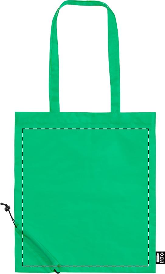 Faltbare Einkaufstasche mit langen Henkeln. Material: 190T RPET-Polyester. Mit RPET-Label.