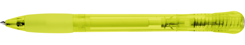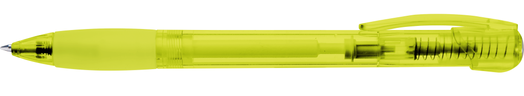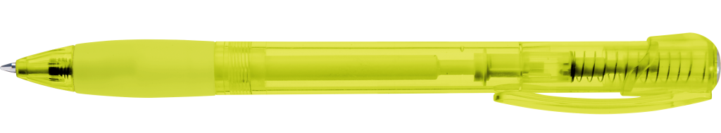 Druckkugelschreiber mit transparent glänzendem Gehäuse, Gummigriffzone und Clipdrücker. Stopfen silber metallic.Druckbereich: Auf dem Clip 33mm x 8mm Tampondruck (T), in Clipverlängerung 38mm x 20mm Siebdruck (S), gegenüber vom Clip 60mm x 13mm Siebdruck (S), seitlich vom Clip 60mm x 13mm Siebdruck (S)