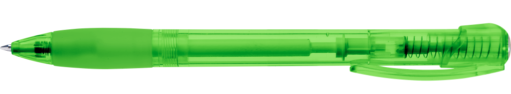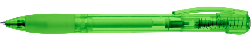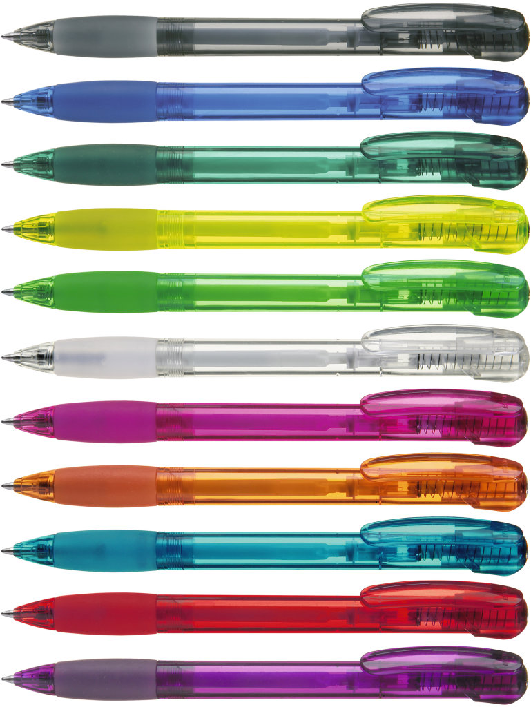 Druckkugelschreiber mit transparent glänzendem Gehäuse, Gummigriffzone und Clipdrücker. Stopfen silber metallic.Druckbereich: Auf dem Clip 33mm x 8mm Tampondruck (T), in Clipverlängerung 38mm x 20mm Siebdruck (S), gegenüber vom Clip 60mm x 13mm Siebdruck (S), seitlich vom Clip 60mm x 13mm Siebdruck (S)