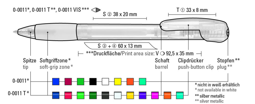 Druckbereich: Auf dem Clip 33mm x 8mm Tampondruck (T), in Clipverlängerung 38mm x 20mm Siebdruck (S), gegenüber vom Clip 60mm x 13mm Siebdruck (S), seitlich vom Clip 60mm x 13mm Siebdruck (S)