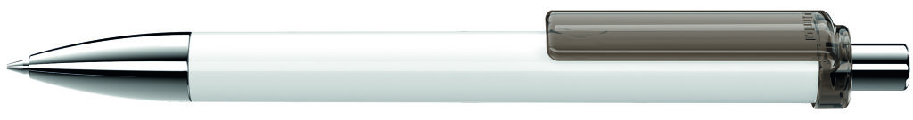 Druckkugelschreiber mit gedeckt glänzendem Schaft, transparent glänzendem Clip, Metallspitze und Metalldrücker glanzverchromt.Druckbereich: Auf dem Clip 35mm x 9mm Tampondruck (T), in Clipverlängerung 40mm x 20mm Siebdruck (S), gegenüber vom Clip 80mm x 13mm Siebdruck (S), seitlich vom Clip 80mm x 13mm Siebdruck (S)