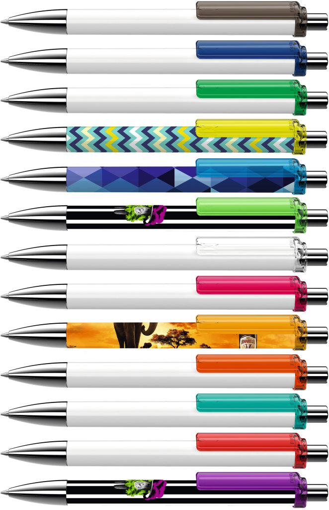 Weißer Kunststoff-Kugelschreiber mit farbigem Clip, blauschreibend.Maße: ø10×138 mmSchreibgerät-Typ: KugelschreiberSchreibgerät-Mechanik: DruckmechanikSchreibfarbe: BlauMinentyp: Normale MineLinienstärke: 1 mmMaterial: Kunststoff (ABS)Veredelungsposition 1: Korpus - rechts vom ClipTechnologie: UV-LED-Druck - EinzelnamenDurchmesser: 0Druckcode: NUVATechnologie: TampondruckMaximale Farben: 4Durchmesser: 0Druckcode: P0Technologie: TampondruckMaximale Farben: 1Durchmesser: 0Druckcode: P1Technologie: UV LED DruckDurchmesser: 0Druckcode: UVAVeredelungsposition 2: Korpus - links vom ClipTechnologie: UV-LED-Druck - EinzelnamenDurchmesser: 0Druckcode: NUVATechnologie: TampondruckMaximale Farben: 4Durchmesser: 0Druckcode: P0Technologie: TampondruckMaximale Farben: 1Durchmesser: 0Druckcode: P1Technologie: UV LED DruckDurchmesser: 0Druckcode: UVAVeredelungsposition 3: KlipTechnologie: TampondruckMaximale Farben: 4Durchmesser: 0Druckcode: P0Veredelungsposition 4: Korpus - in Verlängerung vom ClipTechnologie: TampondruckMaximale Farben: 4Durchmesser: 0Druckcode: P0