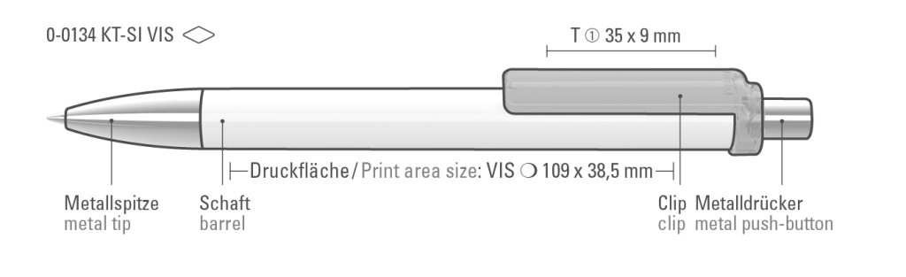 Druckbereich: Auf dem Clip 35mm x 9mm Tampondruck (T), Druckfläche 109mm x 38,5mm VISUAL Folientransferdruck (V)