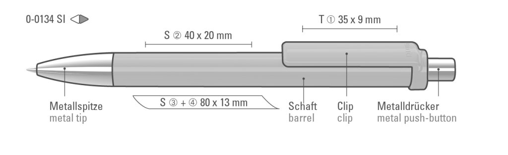 Druckbereich: In Clipverlängerung 40mm x 20mm Siebdruck (S), seitlich vom Clip 80mm x 13mm Siebdruck (S), gegenüber vom Clip 80mm x 13mm Siebdruck (S), auf dem Clip 35mm x 9mm Tampondruck (T)