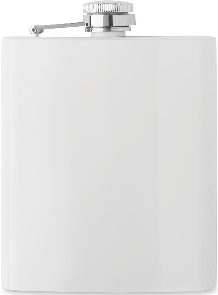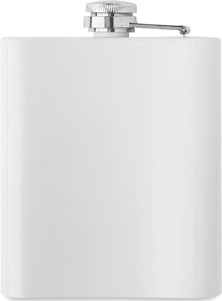 Flachmann aus recyceltem Edelstahl (90% recycelter Edelstahl und 10% Edelstahl). Mit Beschichtung für Sublimation. Einwandig. Füllmenge: 180 ml.