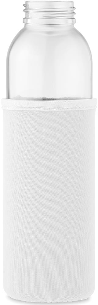 Trinkflasche aus recyceltem Glas mit Neopren-Schutzhülle und PP-Deckel mit Silikon-Schlaufe. Auslaufsicher. Füllmenge: 500 ml.
