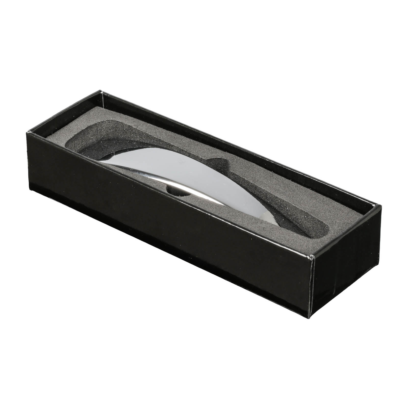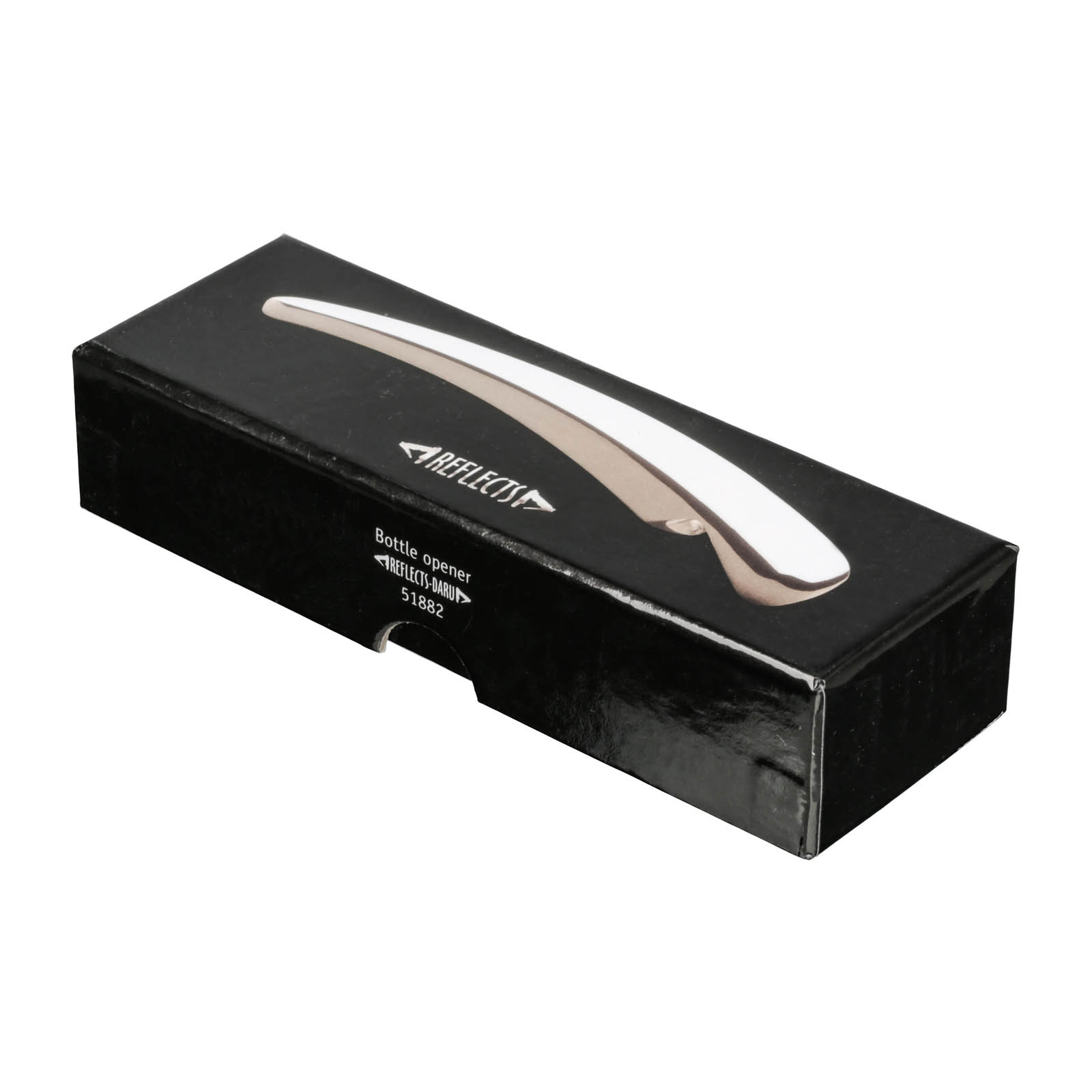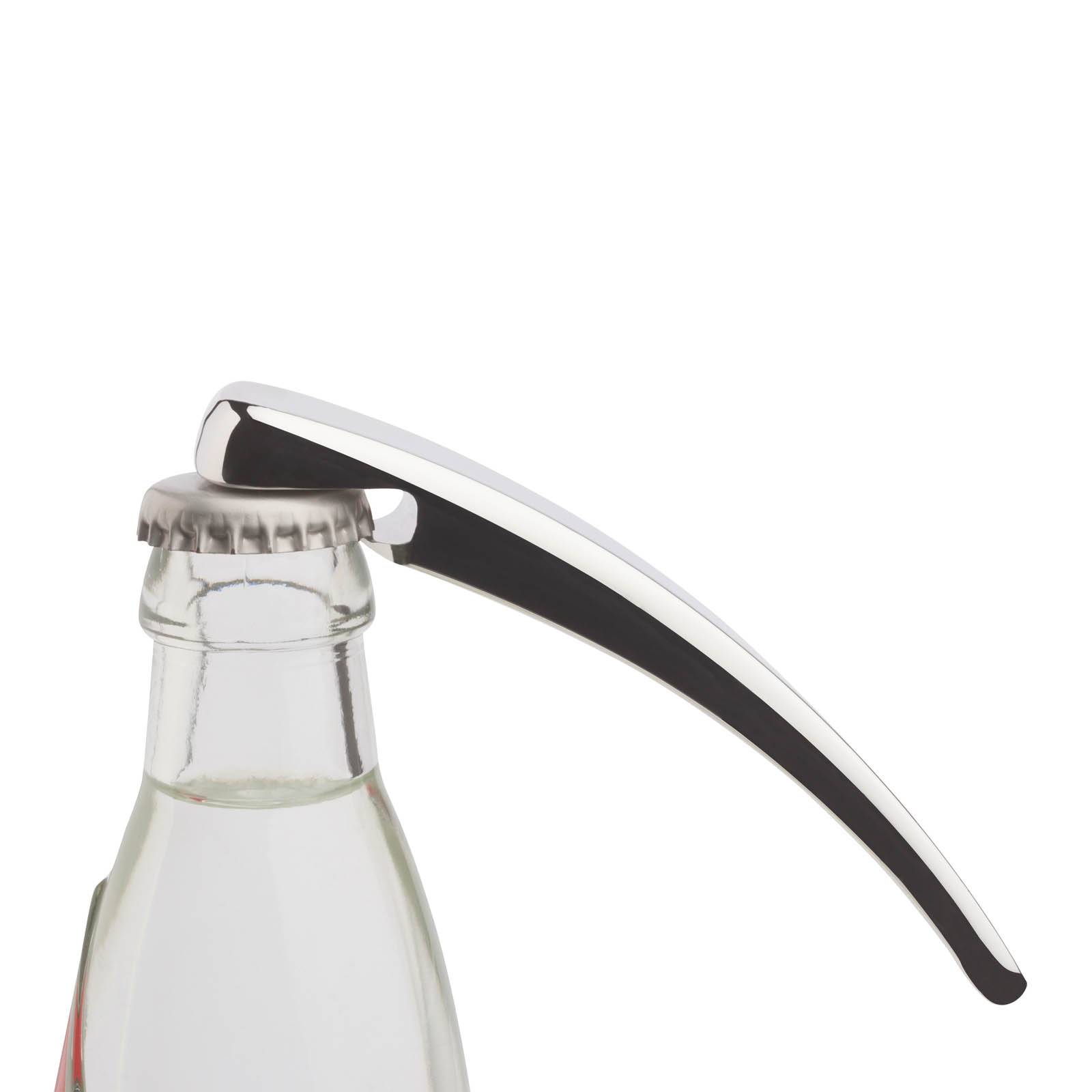 Design für anspruchsvolle Gastgeber. Massiver Metallflaschenöffner mit großer glänzender Werbefläche.