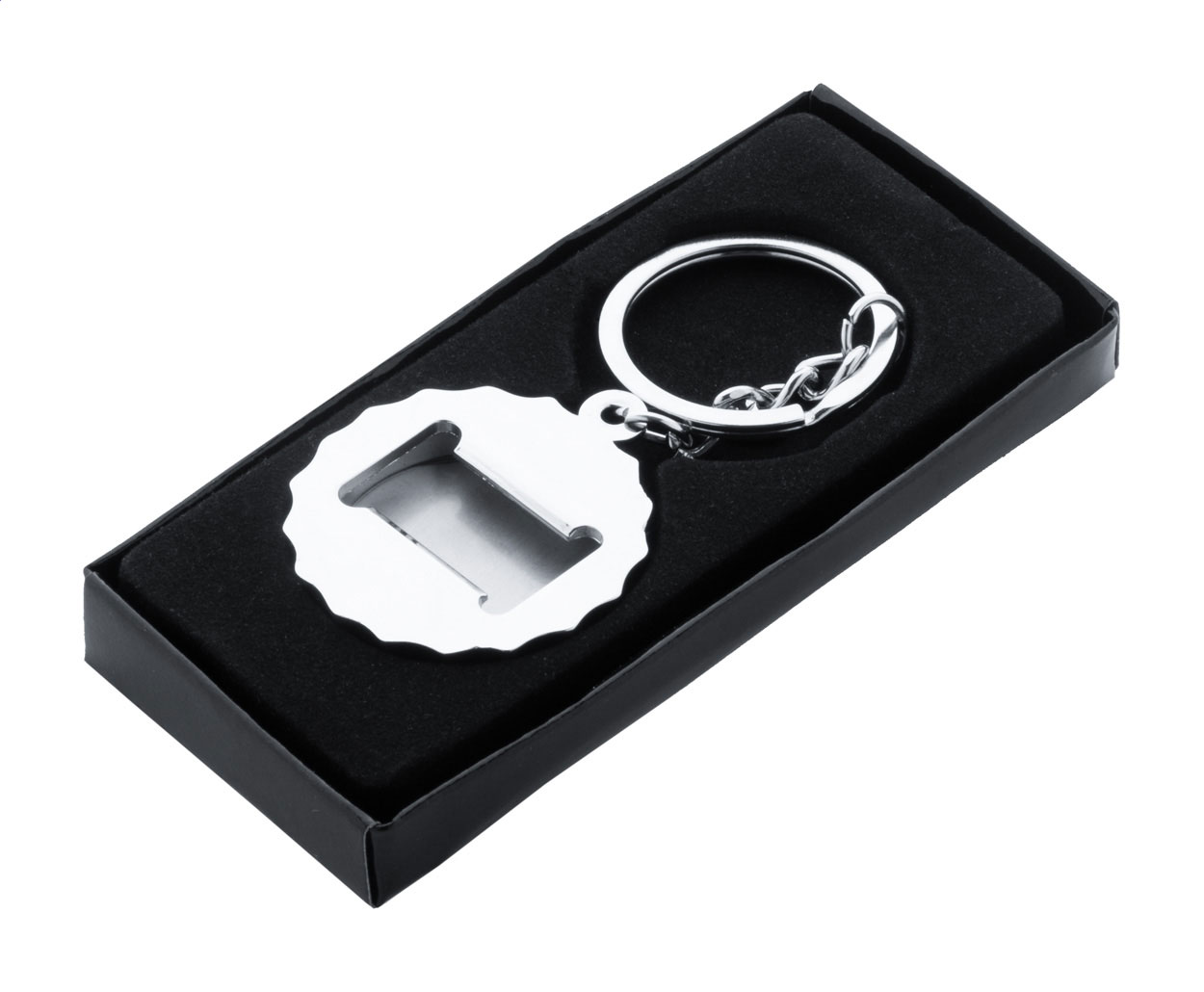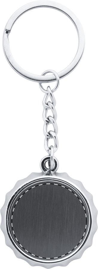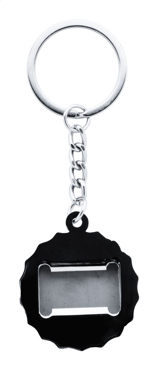 Schlüsselanhänger in Kronkorkenform mit Flaschenöffner. Ideal für Doming-Druck. Einzeln in schwarzer Geschenkbox.