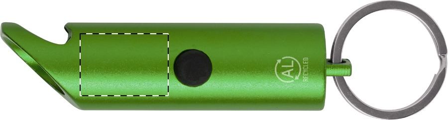 Mini-Taschenlampe aus recyceltem Aluminium mit 3 LED, Flaschenöffner und Schlüsselring. Mit Knopfzellenbatterie.