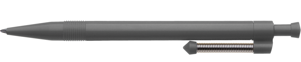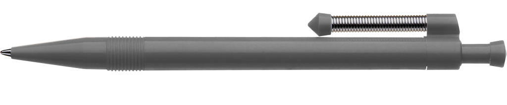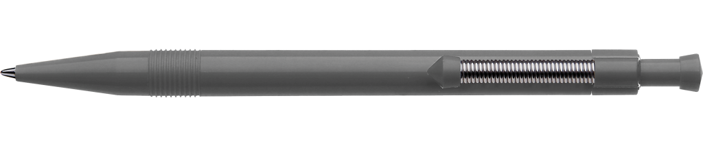 Druckkugelschreiber mit gedecktem Gehäuse und flexiblem und vernickeltem Metallfederclip.