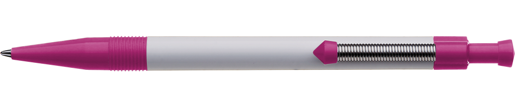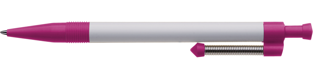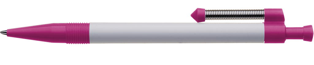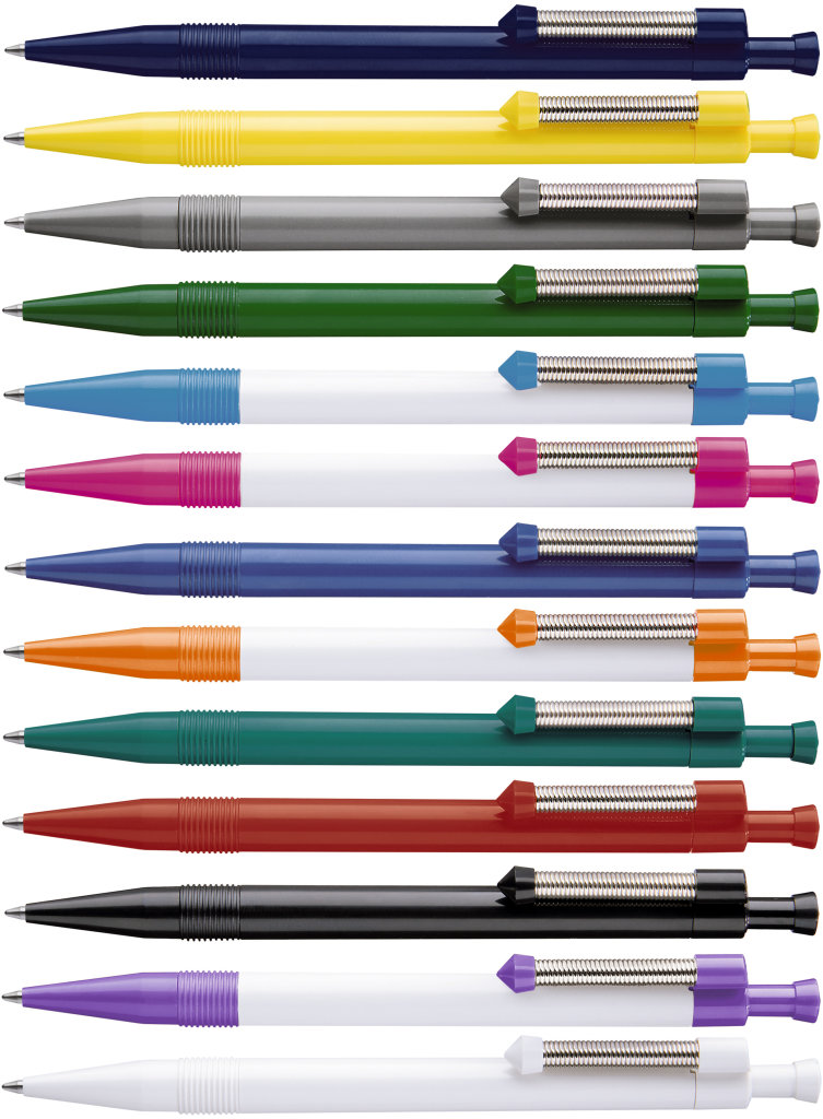 Druckkugelschreiber mit gedecktem Gehäuse und flexiblem und vernickeltem Metallfederclip.