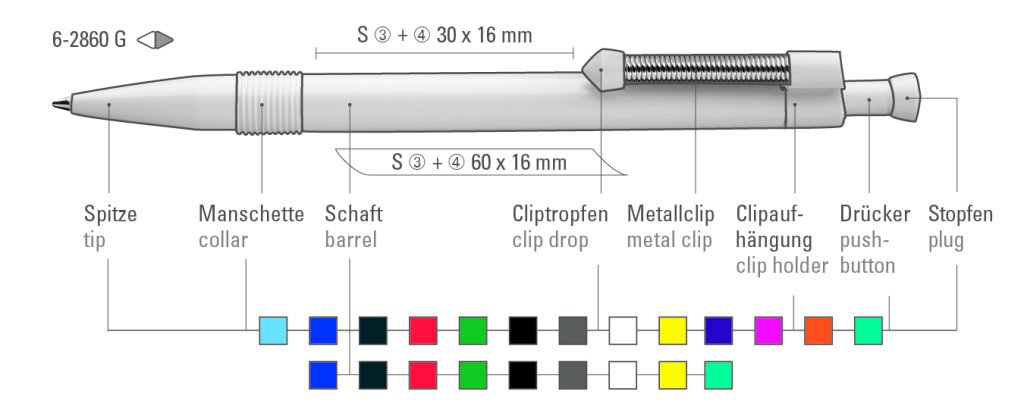 Farbiger Kugelschreiber aus Kunststoff, schwarzschreibend.Maße: ø10×138 mmSchreibgerät-Typ: KugelschreiberSchreibgerät-Mechanik: DruckmechanikSchreibfarbe: SchwarzMinentyp: Normale MineLinienstärke: 1 mmMaterial: KunststoffVeredelungsposition 1: Korpus - rechts vom ClipTechnologie: TampondruckMaximale Farben: 4Durchmesser: 0Druckcode: P0Technologie: TampondruckMaximale Farben: 1Durchmesser: 0Druckcode: P1Technologie: UV LED DruckDurchmesser: 0Druckcode: UVAVeredelungsposition 2: Korpus - links vom ClipTechnologie: TampondruckMaximale Farben: 4Durchmesser: 0Druckcode: P0Technologie: TampondruckMaximale Farben: 1Durchmesser: 0Druckcode: P1Technologie: UV LED DruckDurchmesser: 0Druckcode: UVAVeredelungsposition 3: KlipTechnologie: TampondruckMaximale Farben: 4Durchmesser: 0Druckcode: P0Veredelungsposition 4: Korpus - in Verlängerung vom ClipTechnologie: TampondruckMaximale Farben: 4Durchmesser: 0Druckcode: P0