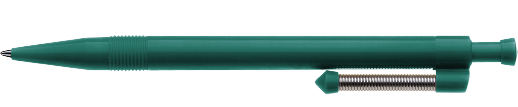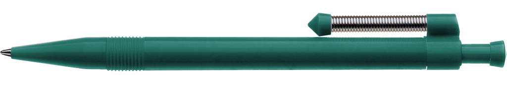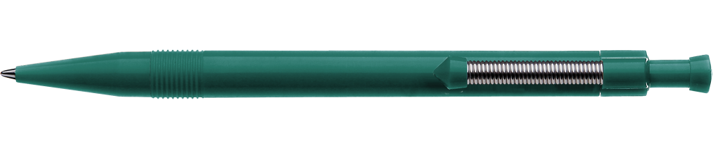 Druckkugelschreiber mit gedecktem Gehäuse und flexiblem und vernickeltem Metallfederclip.