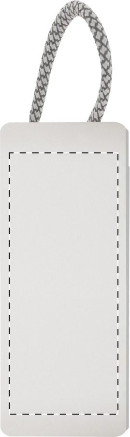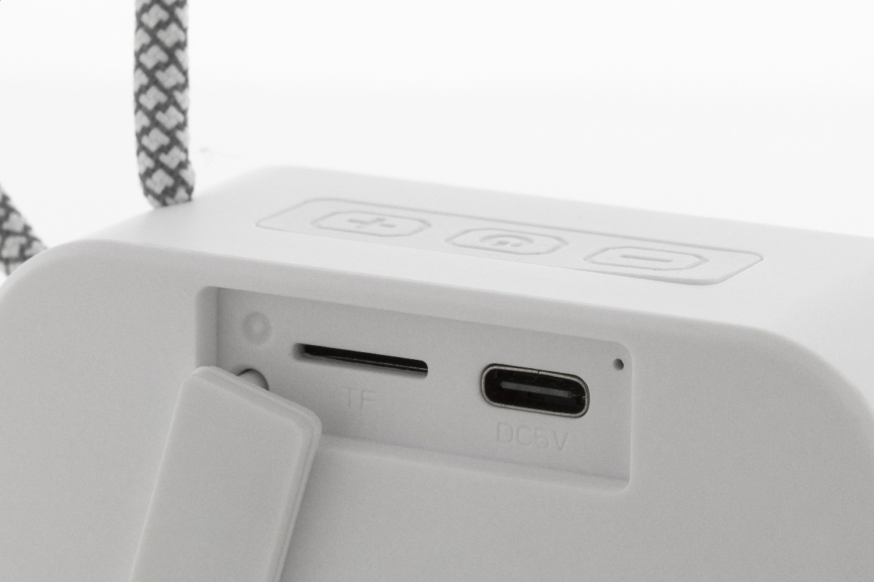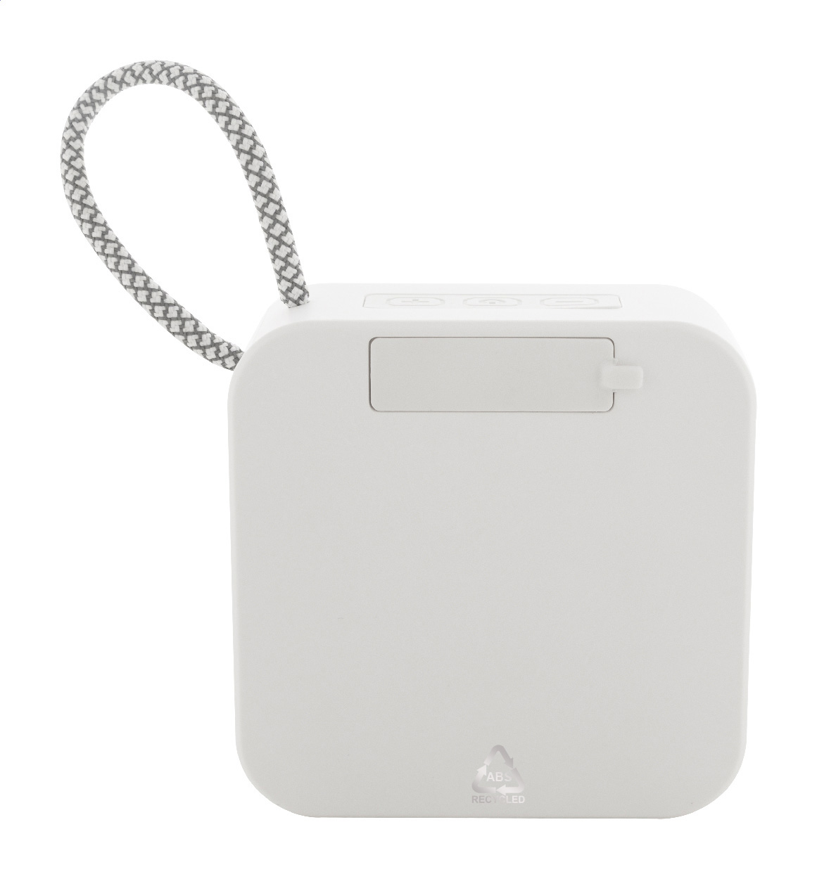 Kabelloser Lautsprecher aus recyceltem ABS mit Trageschlaufe, Metallgitter und wiederaufladbarem Akku (300 mAh). Mit Micro-SD-Funktion zur MP3-Wiedergabe. Inklusive USB-Ladekabel.