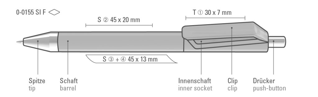 Druckbereich: Auf dem Clip 30mm x 7mm Tampondruck (T), in Clipverlängerung 45mm x 20mm Siebdruck (S), gegenüber vom Clip 45mm x 20mm Siebdruck (S), seitlich vom Clip 45mm x 20mm Siebdruck (S)