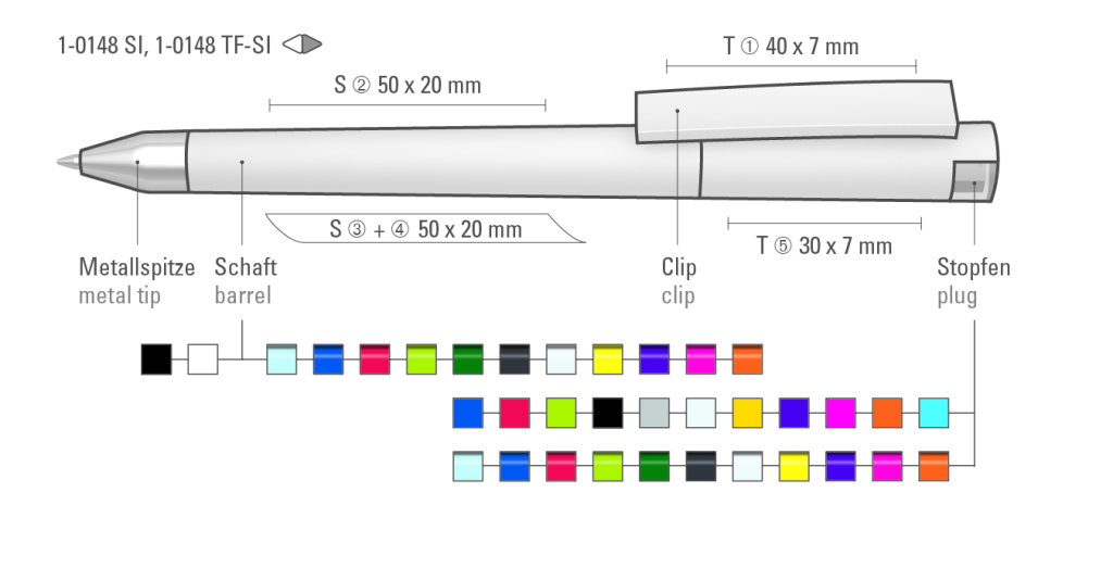 Druckbereich: Auf dem Clip 40mm x 7mm Tampondruck (T), in Clipverlängerung 50mm x 20mm Siebdruck (S), gegenüber vom Clip 50mm x 20mm Siebdruck (S), seitlich vom Clip 50mm x 20mm Siebdruck (S), auf der Kappe/auf dem Oberteil 30mm x 7mm Tampondruck (T), seitliche Clipbefestigung 8mm x 8mm Tampondruck (T)