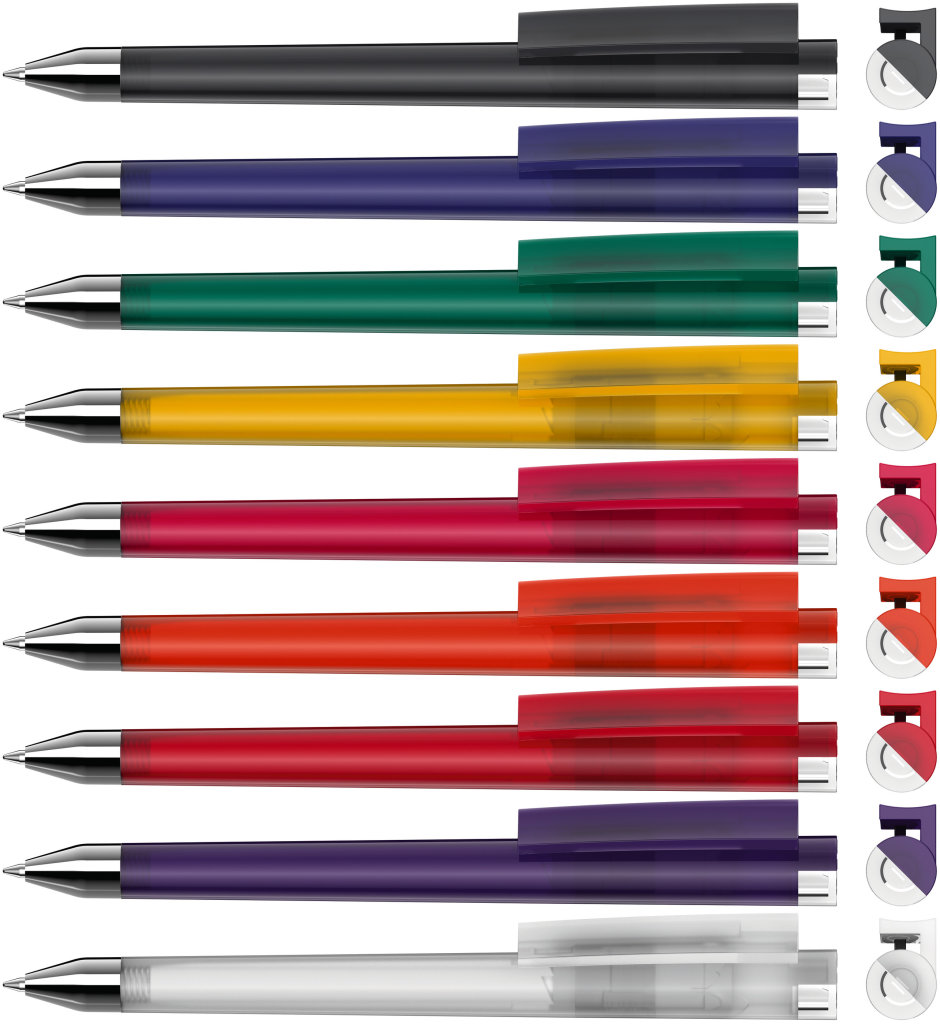 Farbiger Kugelschreiber aus Kunststoff, schwarzschreibend.Maße: ø10×138 mmSchreibgerät-Typ: KugelschreiberSchreibgerät-Mechanik: DruckmechanikSchreibfarbe: SchwarzMinentyp: Normale MineLinienstärke: 1 mmMaterial: KunststoffVeredelungsposition 1: Korpus - rechts vom ClipTechnologie: TampondruckMaximale Farben: 4Durchmesser: 0Druckcode: P0Technologie: TampondruckMaximale Farben: 1Durchmesser: 0Druckcode: P1Technologie: UV LED DruckDurchmesser: 0Druckcode: UVAVeredelungsposition 2: Korpus - links vom ClipTechnologie: TampondruckMaximale Farben: 4Durchmesser: 0Druckcode: P0Technologie: TampondruckMaximale Farben: 1Durchmesser: 0Druckcode: P1Technologie: UV LED DruckDurchmesser: 0Druckcode: UVAVeredelungsposition 3: KlipTechnologie: TampondruckMaximale Farben: 4Durchmesser: 0Druckcode: P0Veredelungsposition 4: Korpus - in Verlängerung vom ClipTechnologie: TampondruckMaximale Farben: 4Durchmesser: 0Druckcode: P0