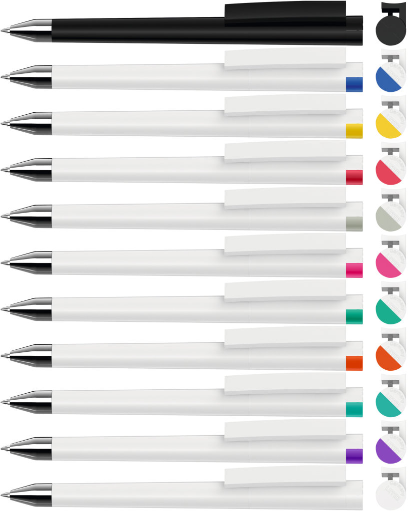 Weißer Kunststoff-Kugelschreiber mit farbigem Clip, blauschreibend.Maße: ø10×138 mmSchreibgerät-Typ: KugelschreiberSchreibgerät-Mechanik: DruckmechanikSchreibfarbe: BlauMinentyp: Normale MineLinienstärke: 1 mmMaterial: Kunststoff (ABS)Veredelungsposition 1: Korpus - rechts vom ClipTechnologie: UV-LED-Druck - EinzelnamenDurchmesser: 0Druckcode: NUVATechnologie: TampondruckMaximale Farben: 4Durchmesser: 0Druckcode: P0Technologie: TampondruckMaximale Farben: 1Durchmesser: 0Druckcode: P1Technologie: UV LED DruckDurchmesser: 0Druckcode: UVAVeredelungsposition 2: Korpus - links vom ClipTechnologie: UV-LED-Druck - EinzelnamenDurchmesser: 0Druckcode: NUVATechnologie: TampondruckMaximale Farben: 4Durchmesser: 0Druckcode: P0Technologie: TampondruckMaximale Farben: 1Durchmesser: 0Druckcode: P1Technologie: UV LED DruckDurchmesser: 0Druckcode: UVAVeredelungsposition 3: KlipTechnologie: TampondruckMaximale Farben: 4Durchmesser: 0Druckcode: P0Veredelungsposition 4: Korpus - in Verlängerung vom ClipTechnologie: TampondruckMaximale Farben: 4Durchmesser: 0Druckcode: P0