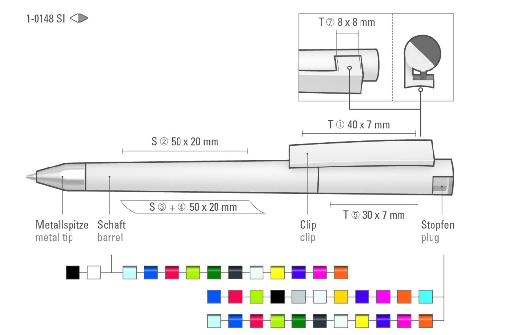 Druckbereich: In Clipverlängerung 50mm x 20mm Siebdruck (S), seitlich vom Clip 50mm x 20mm Siebdruck (S), gegenüber vom Clip 50mm x 20mm Siebdruck (S), auf dem Clip 40mm x 7mm Tampondruck (T), auf der Kappe/auf dem Oberteil 30mm x 7mm Tampondruck (T), seitliche Clipbefestigung 8mm x 8mm Tampondruck (T)