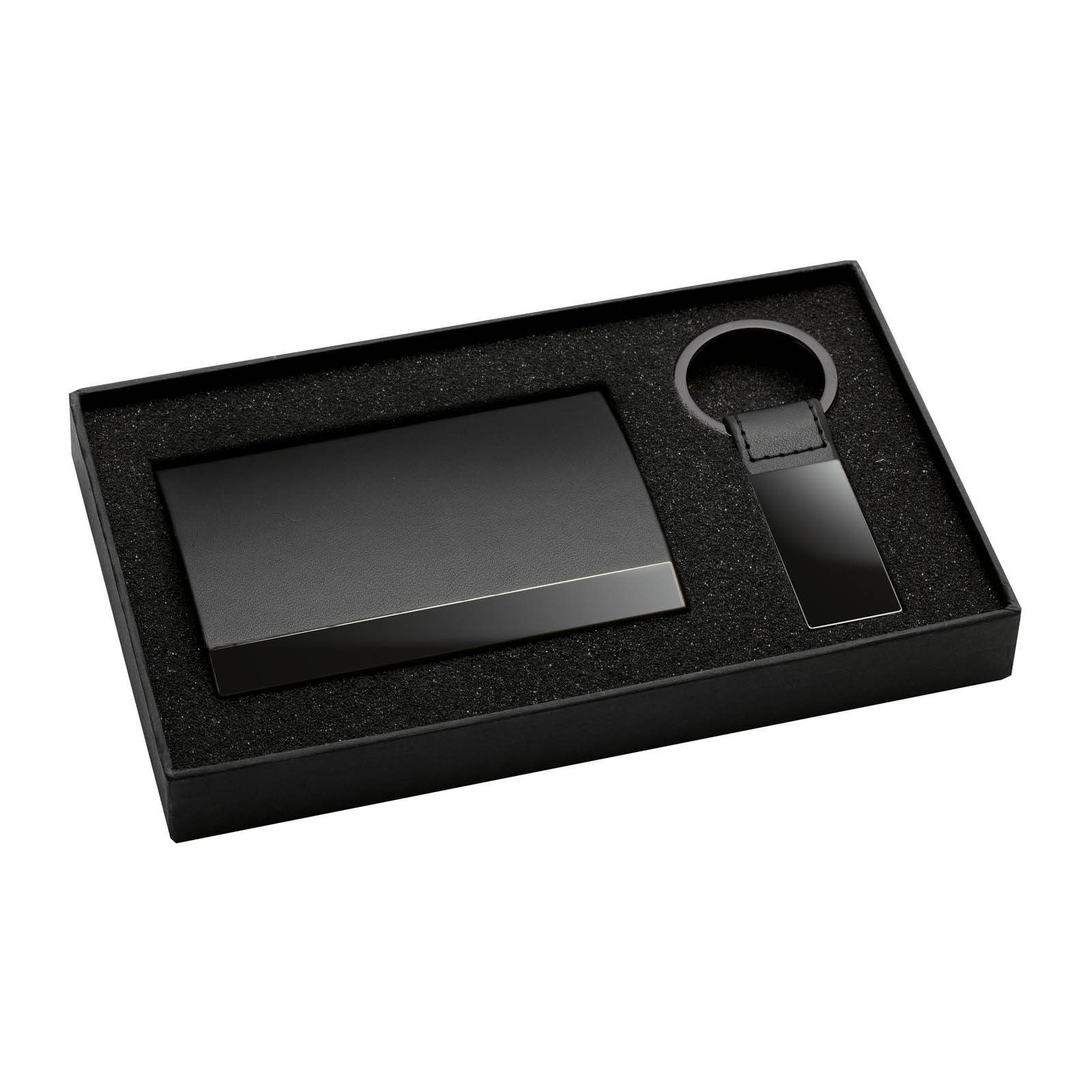 Wenn auch das Überreichen schon eine Freude ist. Das edle Geschenkset aus Schlüsselanhänger und Visitenkartenetuis ist mit einer Lasergravur eine meisterhafte und liebevolle Aufmerksamkeit für Kenner.Kunstleder, Metall, schwarz, silberFarbe: schwarz, silberGewicht: 60,8 gFormat in mm: 155 (L) x 143 (B) x 29 (H)Veredelungsvarianten: Lasergravur, Tampondruck (1c)Druckfläche: 50 x 20 mmHandling: BMaterial: Kunstleder, MetallFarbe: Schwarz, silber