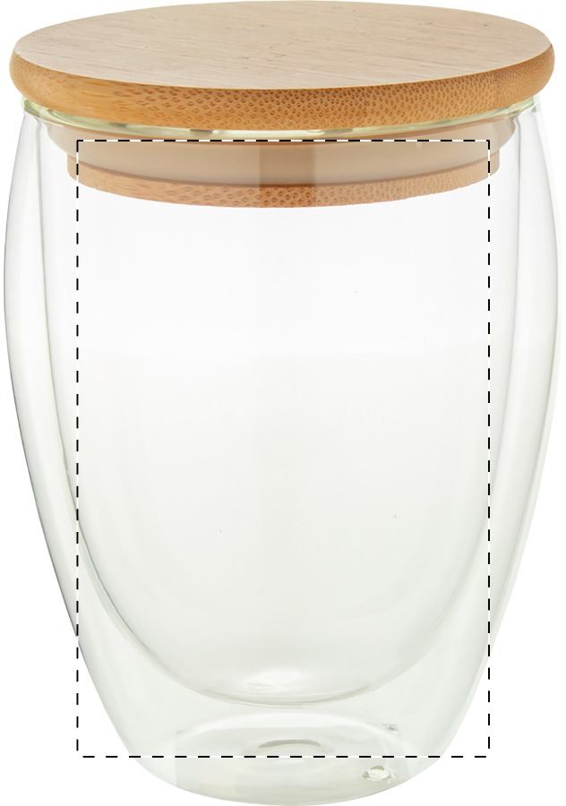 Doppelwandiger Thermobecher aus Borosilikatglas mit Bambusdeckel. Füllmenge: 320 ml. Einzeln in Kraftpapierbox.