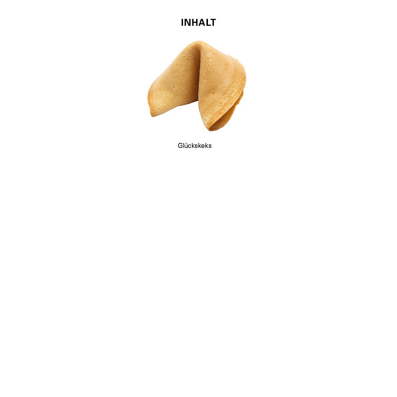 Glückskeks in weißer Folie, individuell bedruckt. Inhalt: 1 Glückskeks aus Weizenteig mit eingebackener Werbebotschaft, 6 g (weißer Innenzettel, individuell bedruckt., 1c schwarz, beidseitiger Druck Anfrage)