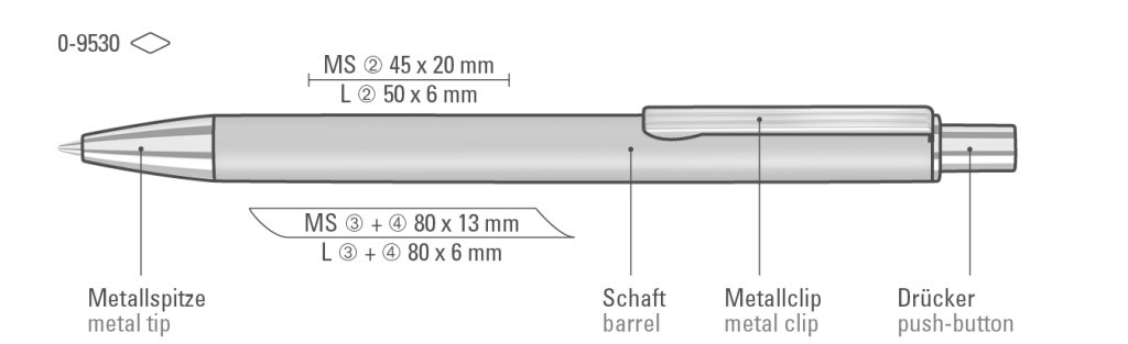 Druckbereich: In Clipverlängerung 45mm x 20mm Siebdruck (MS), in Clipverlängerung 50mm x 6mm Lasergravur (L), seitlich vom Clip 80mm x 13mm Siebdruck (MS), seitlich vom Clip 80mm x 6mm Lasergravur (L), gegenüber vom Clip 80mm x 13mm Siebdruck (MS), gegenüber vom Clip 80mm x 6mm Lasergravur (L), in Clipverlängerung 50mm x 6mm Einzelnamensgravur (EL), seitlich vom Clip 80mm x 6mm Einzelnamensgravur (EL), gegenüber vom Clip 80mm x 6mm Einzelnamensgravur (EL)