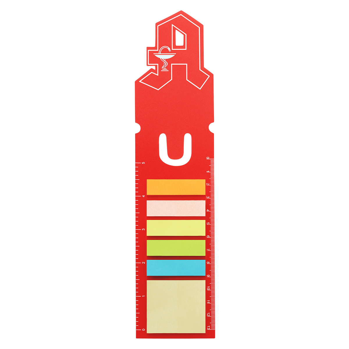 Mit jeweils ca. 25 Haftnotizmarkern in 6 verschiedenen Farben (ca. 12 x 45 mm und ca. 40 x 45 mm) und gedruckten Skalen (13 cm und 5 Inch). Besonders geeignet für Mailings.
