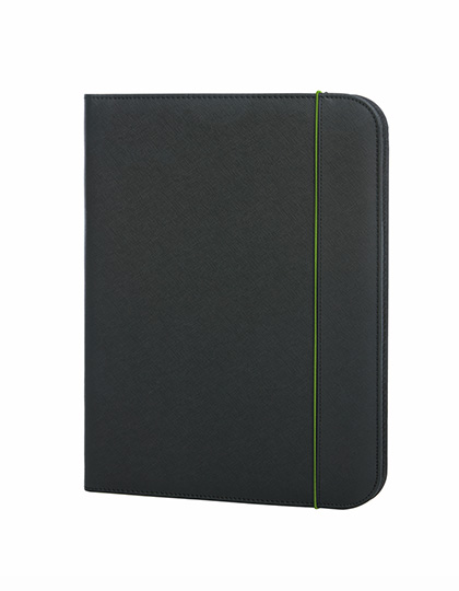 Schwarze Schreibmappe mit Organizer-ElementenVerschließbar mit farbigem GummibandSchreibblockFlaches EinsteckfachGummischlaufe für KugelschreiberLieferung ohne Inhalt/DekoMaterial: PU-KunstlederGewicht: 0.67Hergestellt nach: Faire ArbeitsbedingungenVeredelung: Bestickung, Bedruckung, BeflockungGröße: 25 x 32 x 2 cm