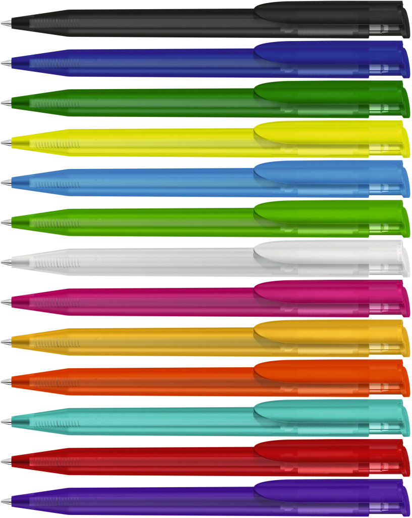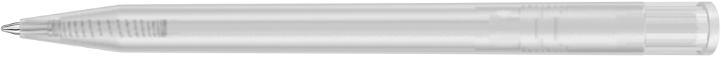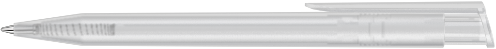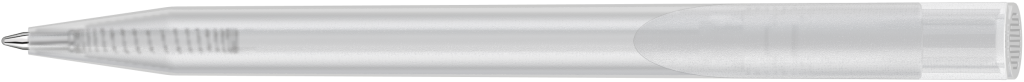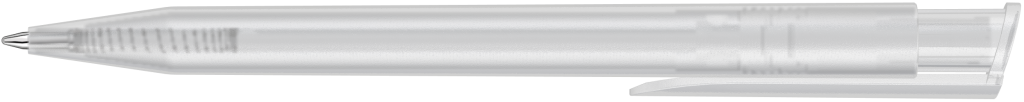 Druckkugelschreiber mit transparent gefrostetem Gehäuse und Clipdrücker.