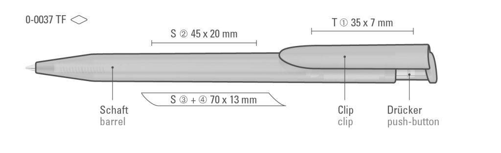 Druckbereich: Auf dem Clip 35mm x 7mm Tampondruck (T), in Clipverlängerung 45mm x 20mm Siebdruck (S), gegenüber vom Clip 70mm x 13mm Siebdruck (S), seitlich vom Clip 70mm x 13mm Siebdruck (S)
