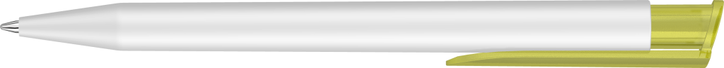Druckkugelschreiber mit gedeckt mattem Gehäuse in weiß und farbig transparent gefrostetem Clipdrücker.Druckbereich: Auf dem Clip 35mm x 7mm Tampondruck (T), in Clipverlängerung 45mm x 20mm Siebdruck (S), gegenüber vom Clip 70mm x 13mm Siebdruck (S), seitlich vom Clip 70mm x 13mm Siebdruck (S)
