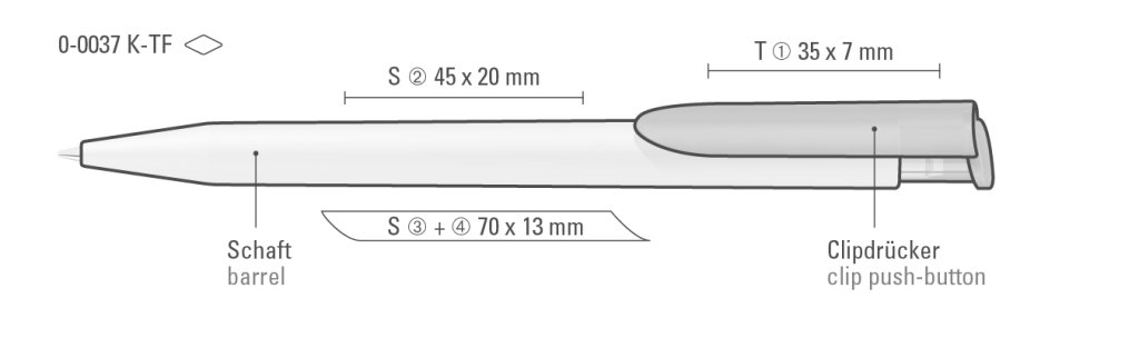 Druckbereich: Auf dem Clip 35mm x 7mm Tampondruck (T), in Clipverlängerung 45mm x 20mm Siebdruck (S), gegenüber vom Clip 70mm x 13mm Siebdruck (S), seitlich vom Clip 70mm x 13mm Siebdruck (S)