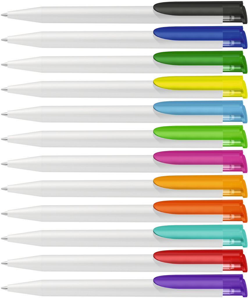 Weißer Kunststoff-Kugelschreiber mit farbigem Clip, blauschreibend.Maße: ø10×138 mmSchreibgerät-Typ: KugelschreiberSchreibgerät-Mechanik: DruckmechanikSchreibfarbe: BlauMinentyp: Normale MineLinienstärke: 1 mmMaterial: Kunststoff (ABS)Veredelungsposition 1: Korpus - rechts vom ClipTechnologie: UV-LED-Druck - EinzelnamenDurchmesser: 0Druckcode: NUVATechnologie: TampondruckMaximale Farben: 4Durchmesser: 0Druckcode: P0Technologie: TampondruckMaximale Farben: 1Durchmesser: 0Druckcode: P1Technologie: UV LED DruckDurchmesser: 0Druckcode: UVAVeredelungsposition 2: Korpus - links vom ClipTechnologie: UV-LED-Druck - EinzelnamenDurchmesser: 0Druckcode: NUVATechnologie: TampondruckMaximale Farben: 4Durchmesser: 0Druckcode: P0Technologie: TampondruckMaximale Farben: 1Durchmesser: 0Druckcode: P1Technologie: UV LED DruckDurchmesser: 0Druckcode: UVAVeredelungsposition 3: KlipTechnologie: TampondruckMaximale Farben: 4Durchmesser: 0Druckcode: P0Veredelungsposition 4: Korpus - in Verlängerung vom ClipTechnologie: TampondruckMaximale Farben: 4Durchmesser: 0Druckcode: P0